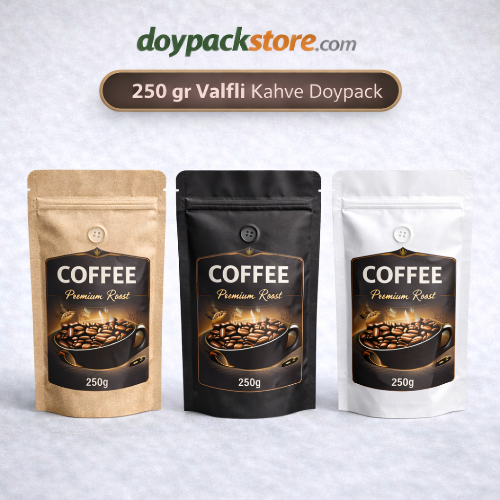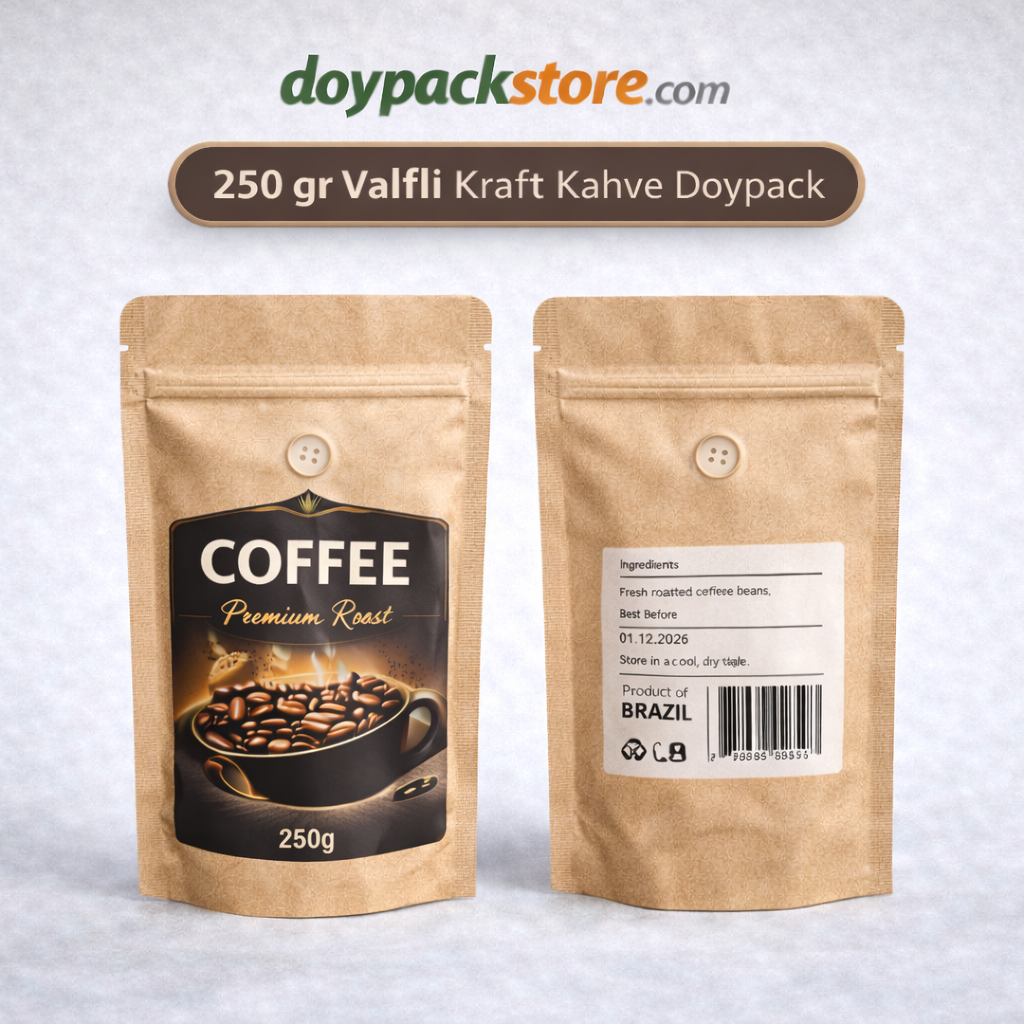 250 gr Valfli Kraft Kahve Doypack, kahve çekirdeği ve öğütülmüş kahvenin aroma ve tazeliğini korumak için geliştirilmiş, tek yönlü aroma valfli ve zip kilitli profesyonel ambalaj çözümüdür. Valf sistemi sayesinde kahve içerisindeki gaz dışarı atılırken dış hava içeri girmez.